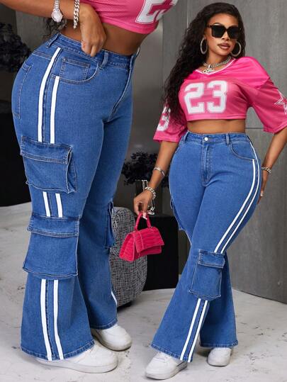 SHEIN SXY 大码弹力牛仔连体裤,配松紧腰带 - 中等水洗藍 - 查看 8