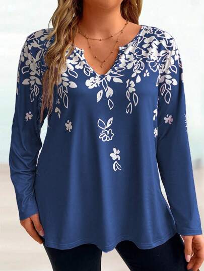 EMERY ROSE 大码缺口领口花卉印花休闲长袖T恤图案T恤女式春季上衣 - 寶藍色 - 查看 1