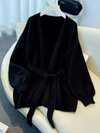 女士优雅休闲针织开衫,宽松休闲风格,时尚简约通勤毛衣外套,系带腰身上衣外套,复古别致街头风黑色