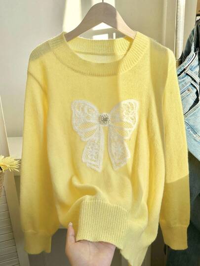 Comfortcana 大码女式休闲可爱蝴蝶结刺绣仿珍珠水晶装饰套头衫,秋季 - 黃色 - 查看 1