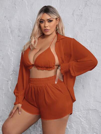 SHEIN SXY 大尺碼女性時尚上衣和短褲套裝 - 鏽棕色 - 查看 1