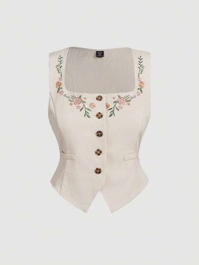 SHEIN MOD 大码女式刺绣短腰短款西装外套(杏色) - 杏色 - 查看 1