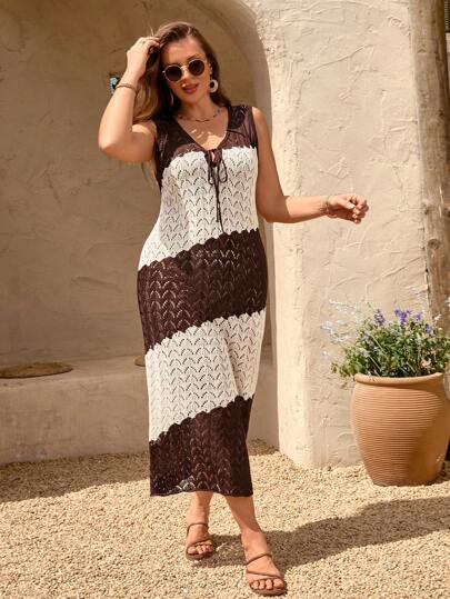 SHEIN Privé 大码女式镂空休闲度假优雅简约高端针织毛衣连衣裙 - 卡其色 - 查看 1