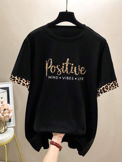 Mulvari 大码女式字母豹纹拼布圆领短袖 T 恤 - 彩色 - 查看 5