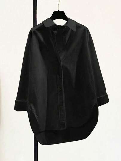 大码女式常规长度衬衫领上衣,落肩长袖,纽扣装饰不对称下摆 - 黑色 - 查看 1