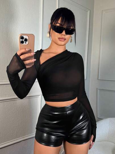 SHEIN SXY 大码女式性感不对称领口透视网眼衬衫 - 黑色 - 查看 1