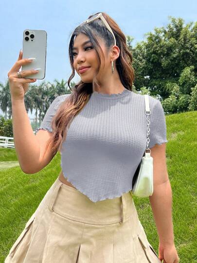 SHEIN EZwear 大码女式短袖圆领荷叶边休闲T恤 - 灰色 - 查看 1