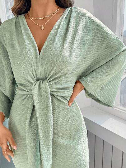 SHEIN Clasi 大码女式纯色腰带蝙蝠袖侧开衩紧身迷你连衣裙 - 綠色 - 查看 1