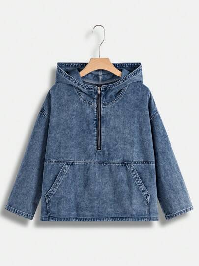 SHEIN ICON 大码女式春秋落肩拉链连帽牛仔夹克 - 深色水洗藍 - 查看 1