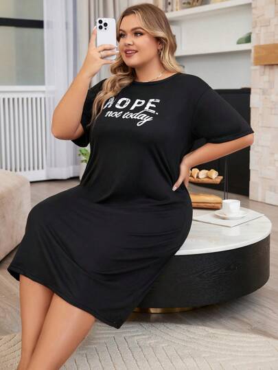 加大码标语图案睡衣睡裙,哞哞睡裙 - 黑色 - 查看 1