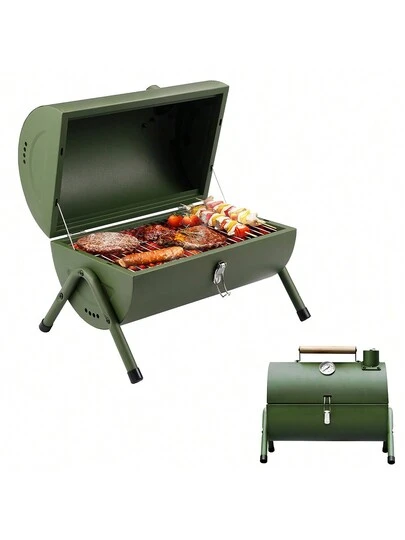 便攜式木炭烤肉爐多功能金屬小型燒烤煙燻器適合戶外健行野餐 - 軍綠色 - 查看 1