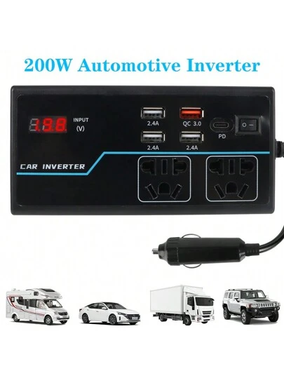 电源适配器 8 端口插座 DC 12V/24V 至 AC 110V/220V 转换器 200W 过载保护车载逆变器 USB/PD/Type-C 充电器 - 黑色 - 查看 1