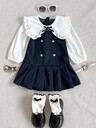 PrepCrw 1 件青少年女孩优雅校园风格休闲都市白色装饰黑色圆领长袖连衣裙,适合外出、聚会、返校、夏季和秋季