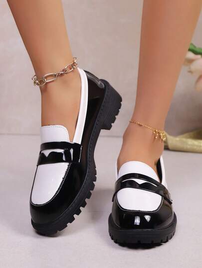 春秋新款学院风休闲平底乐福鞋,圆头套脚设计,低跟,牛津鞋款式,时尚百搭,简约优雅黑白皮鞋 - 黑與白 - 查看 1