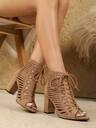 秋冬宽楦女式黑色踝靴 春夏新款时尚百搭后拉链系带镂空透气露趾高跟靴 户外舒适大码粗跟靴