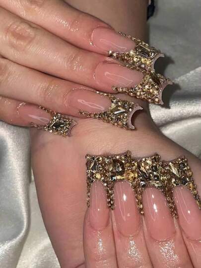Y2K 24 件长棺材形 3D 水钻美甲装饰,配 1 个指甲锉和 1 个果冻胶按压指甲美甲用品 - 金色 - 查看 3