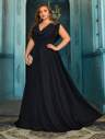 端庄气质大码女式海军蓝亮片拼接贴花V领网纱礼服连衣裙