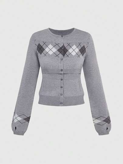 ROMWE 2件套Y2K休闲复古硬币纹闪电格纹开衫和吊带背心套装 - 灰色 - 查看 1