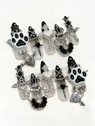 ROMWE Anime 10张Y2K可爱爱心、星星、蝴蝶结、翅膀美甲贴纸,带胶带 - 黑色 - 查看 1