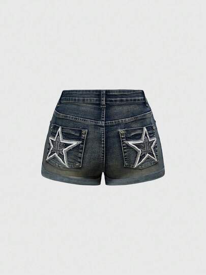 ROMWE Avant 女士Y2K时尚星形牛仔短裤 - 藍色 - 查看 4