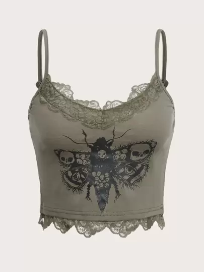 ROMWE Goth 蝴蝶骷髅頭圖案蕾絲拼接吊帶上衣 - 軍綠色 - 查看 1