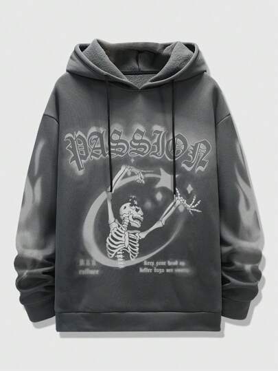 ROMWE MEN Grunge Punk 男士休閒骷髏字母印花連帽衫 - 深灰色 - 查看 1