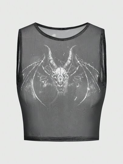 ROMWE Goth 骷髏&翅膀印花網紗背心上衣 - 黑色 - 查看 1