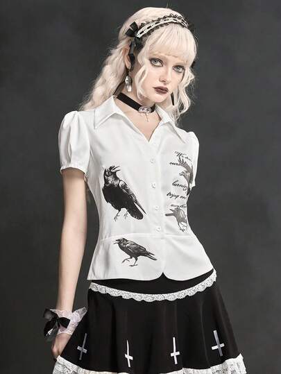 ROMWE Goth 哥特萝莉乌鸦印花泡泡袖修身女式衬衫 - 白色 - 查看 1