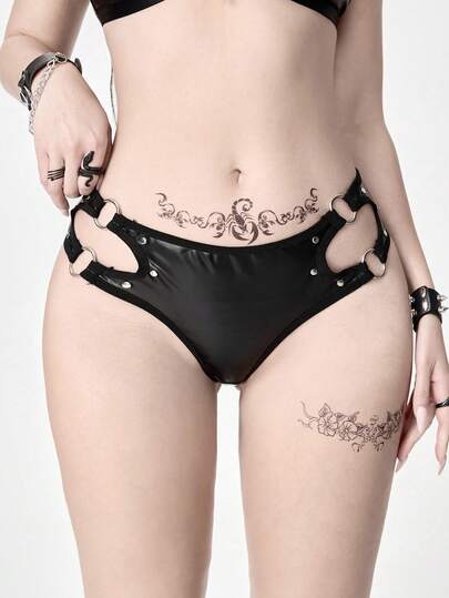 ROMWE Grunge Punk 哥特朋克风PU皮革金属环三角内裤 - 黑色 - 查看 1