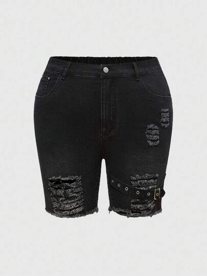 ROMWE Grunge Punk 大码女式口袋做旧可调节带扣设计休闲牛仔短裤