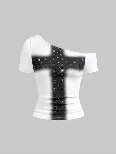 ROMWE Grunge Punk 朋克金属铆钉十字印花紧身肩部T恤 - 白色 - 查看 1