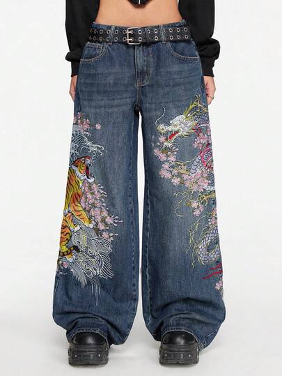 ROMWE Grunge Punk 男女皆宜的复古街头风中国虎纹花卉刺绣宽松阔腿牛仔裤 - 藍色 - 查看 1