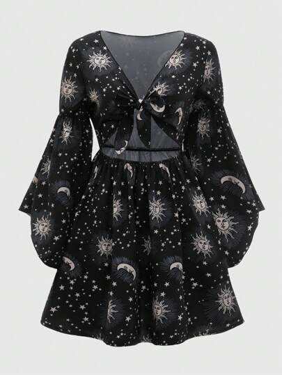 ROMWE Hippie 太陽月亮圖案鏤空洋裝 - 黑與白 - 查看 1