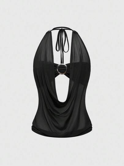 ROMWE Hippie 女式 Y2K 复古深垂领露背街头风格露肩背心(含抹胸衬里) - 黑色 - 查看 1