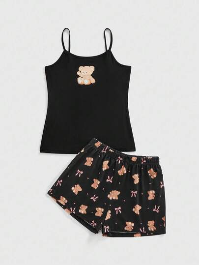 ROMWE Kawaii 可爱卡通蝴蝶结小熊吊带短裤睡衣套装 - 黑色 - 查看 1