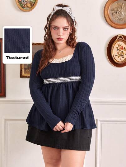 ROMWE Kawaii 加大对比色蕾丝荷叶边娃娃装 T 恤,学校 - 藏蓝色 - 查看 1
