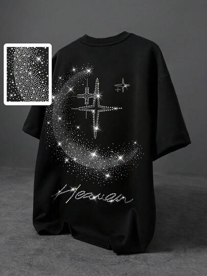 ROMWE MEN 男士圆领短袖月亮星星水钻装饰T恤 - 黑色 - 查看 1
