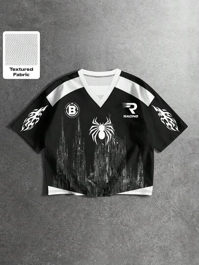 ROMWE MEN Prep 男士V领短袖时尚印花休闲透气夏季T恤 - 彩色 - 查看 1