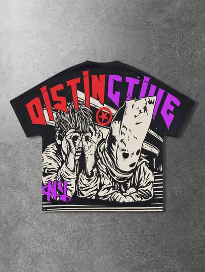 ROMWE MEN Street Life 男士休闲卡通字母印花T恤,夏季款 - 黑色 - 查看 1
