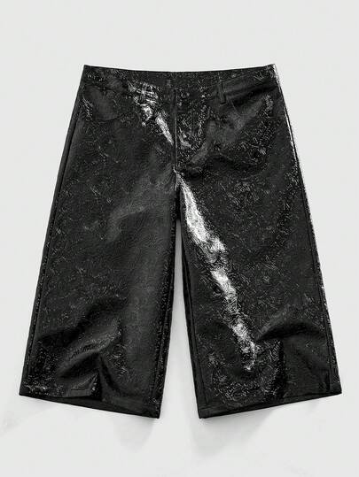 ROMWE MEN Street Life 男士PU纹理阔腿宽松休闲短裤 - 黑色 - 查看 1