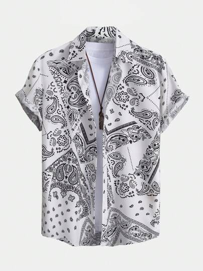 ROMWE MEN Street Life 男士佩斯利印花衬衫(不含 T 恤,学校) - 黑與白 - 查看 1