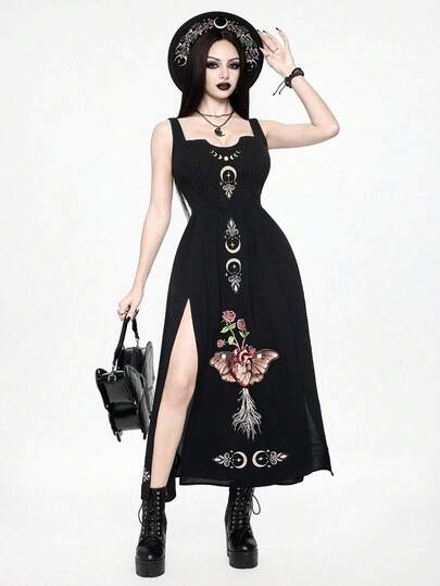 ROMWE Goth 哥特风心形、蝴蝶、星星和月亮印花双开衩连衣裙 - 黑色 - 查看 1