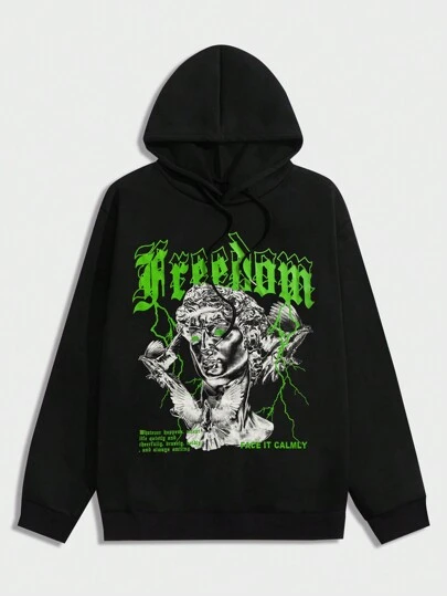 ROMWE MEN Street Life 男士字母人物圖案抽繩連帽衫 - 黑色 - 查看 1