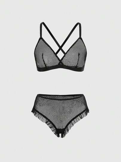 ROMWE Goth 女士哥特式交叉网眼三角杯文胸和内裤性感内衣套装 - 黑色 - 查看 1