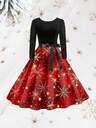 圣诞节复古圣诞树、驯鹿、雪人印花高腰拼接长袖 A 字裙配丝带