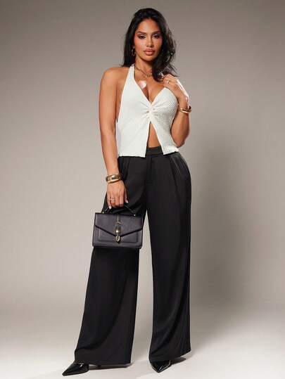 Radiana 女士简约现代黑色缎面宽松阔腿西装裤,办公长裤,黑色阔腿裤,高腰阔腿裤,黑色西装裤,缎面长裤,缎面西装裤,黑色长裤,休闲裤 - 黑色 - 查看 1