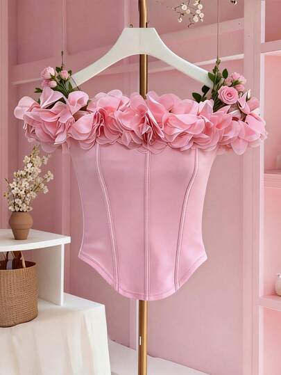Rafferiza 3D立体花卉露肩针织弹力无袖上衣,粉色,适合春夏各种场合:约会、派对、外出、通勤、优雅、奢华、休闲、日常、百搭、职业装、婚礼、新年派对、毕业典礼、角色扮演、感恩节 - 粉色 - 查看 1