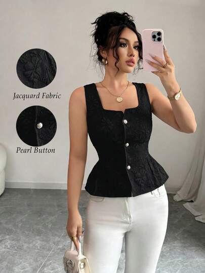 Rafferiza 休闲时尚百搭方领纽扣收腰修身无袖女式背心,优雅时尚年轻短款上衣,夏季新款,浅蓝色花卉纹理面料 - 黑色 - 查看 1