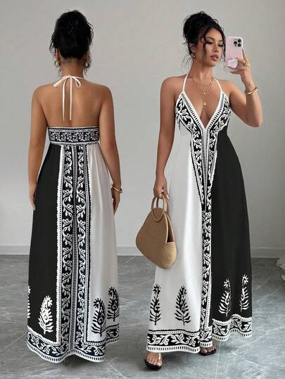 Rafferiza 女士碎花深V领连衣裙 - 黑與白 - 查看 1