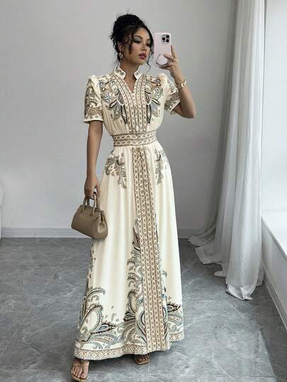 Rafferiza 复古印花收腰短款花瓣袖连衣裙 - 杏色 - 查看 1